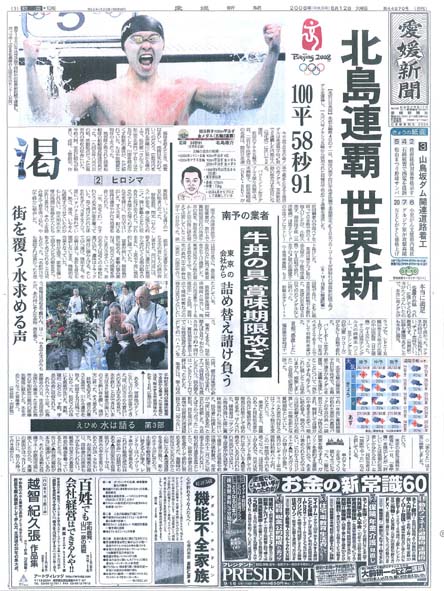 愛媛新聞の1面(2008.8.12)に北島選手の金メダルと一緒に、広島の水場を守る会が掲載されました。 (C)2008.8.6錦川鯉撮影。 |