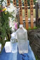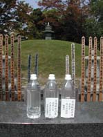 '06原爆献水 お礼とご報告 原爆献水供養に名水をご持参またはお届けいただき、誠にありがとうございました。広島の水場を守る会では、2006.8.6の早朝5:00から己斐滝の観音において、原爆語り部の宇根利枝さんと一緒に滝に打たれる自然体験をしました。その後、移動して、AM6:00に平和公園供養塔に集合し、送られてきた名水を原爆献水としてお供えをいたしました。 広島の水場を守る会 錦川 鯉、他29名より 2006年8月6日 |