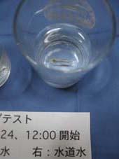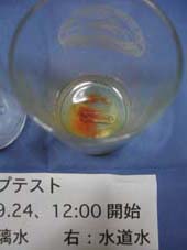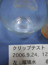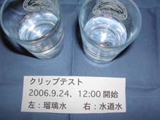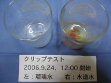 水とクリップがあれば、だれでも簡単にできるテストです。 瑠璃水の採水日2006.9.23、実験開始2006.9.24、12:00~ |