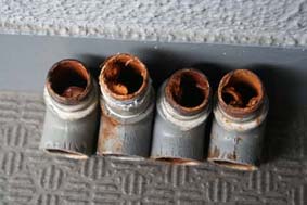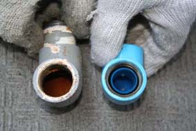 私の住むマンション(築26年)では、水道給水管を26年ぶりに交換した。 写真左は、この日まで使用していたビニールライニング継手というもので、錆が固まりになって付着していた。 塩素が給水管の内側を錆させるのだそうだ。 写真右の右は、この度、交換された新しい給水管だ。管の内側がブルーの樹脂になっている。ビニールライニングコア入り継手というもので、サビが定着しないらしい。 コア入りは、水道局指定なのである。 最近ではバルブもコア入りになっているのだそうだ。 (取材協力:株パンネックス 山本勝見社長) |